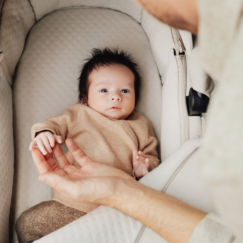 Внутреннее пространство люльки отделано мягкими и гипоаллергенными материалами класса люкс, которые легко снимаются для стирки. На дне эргономичный плотный матрасик со съемной наволочкой. В жаркое время года можно открыть вентиляционные окошка на капоре и в изголовье, так вы обеспечите комфортный для младенца микроклимат и постоянный приток свежего воздуха, а подросший малыш сможет лёжа на животике изучать окружающий мир.