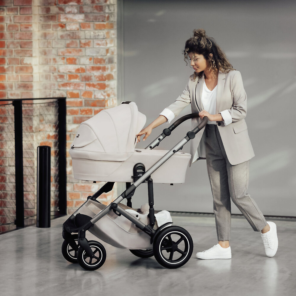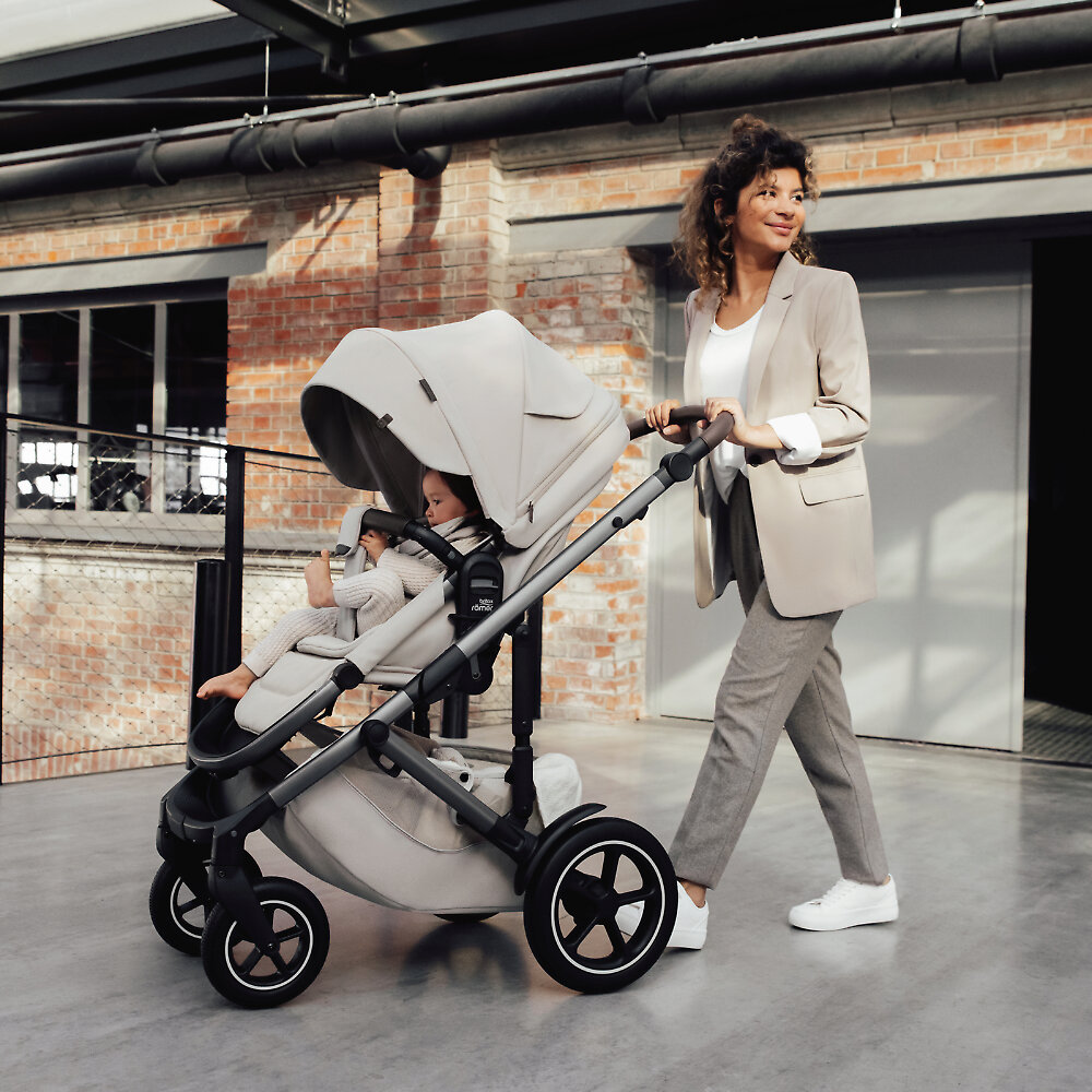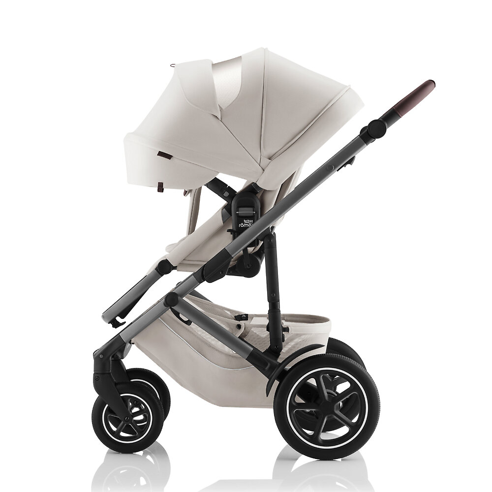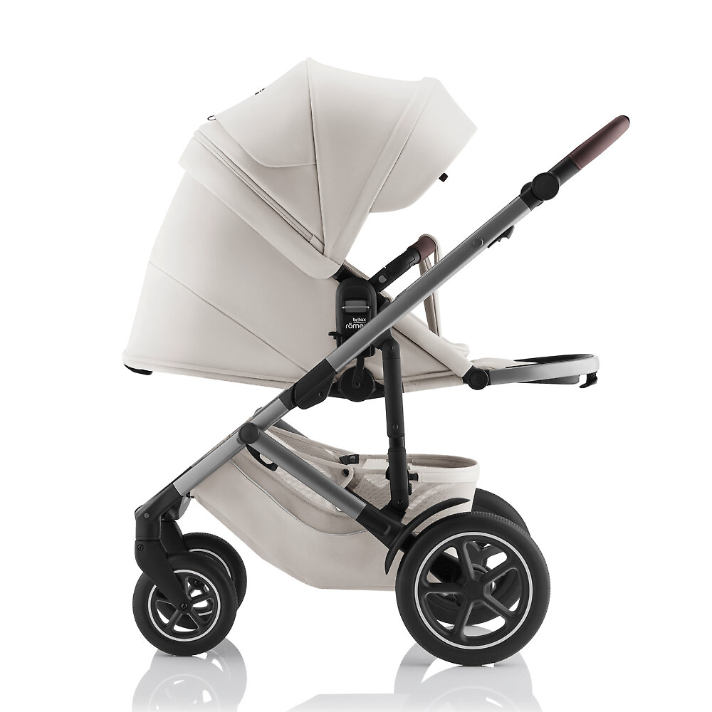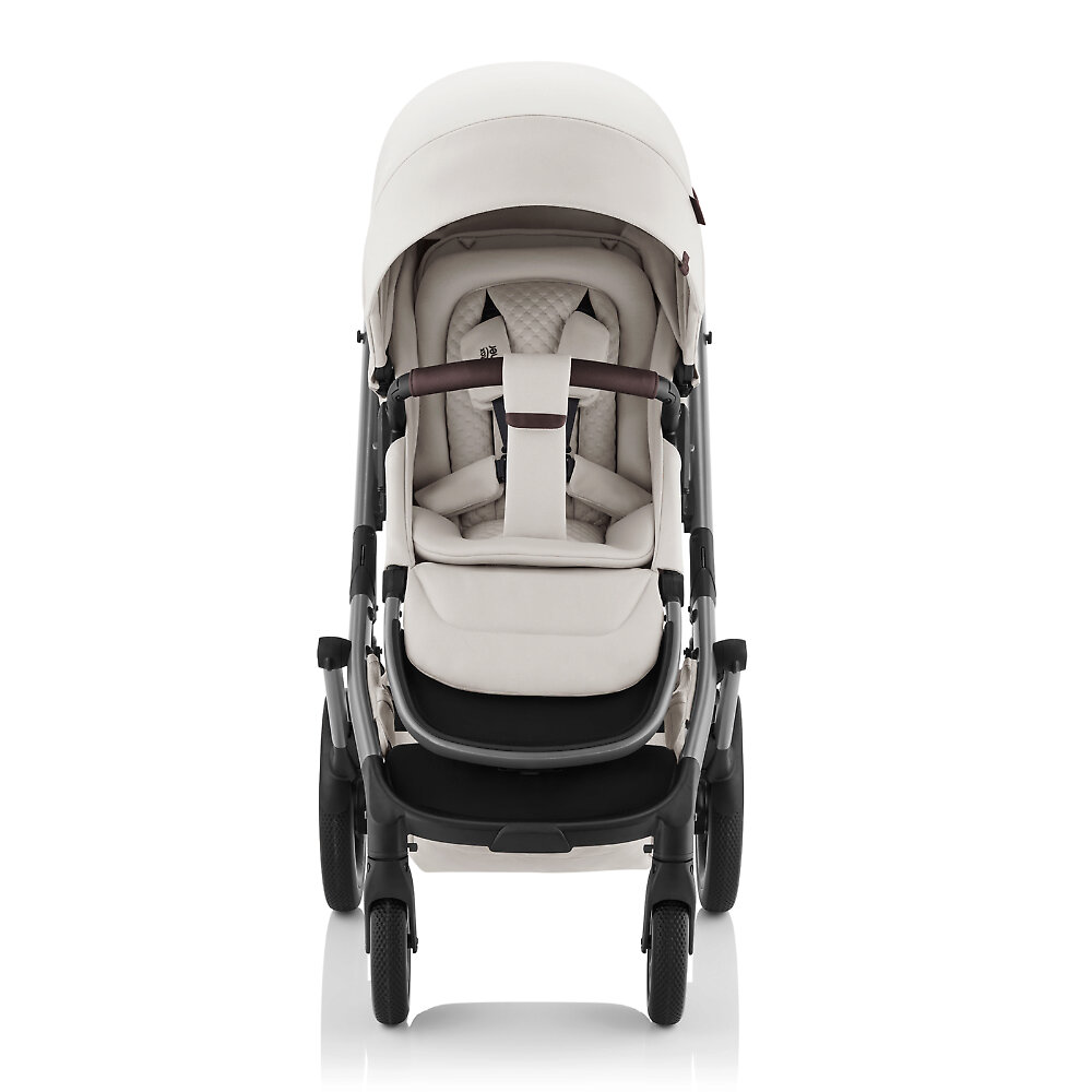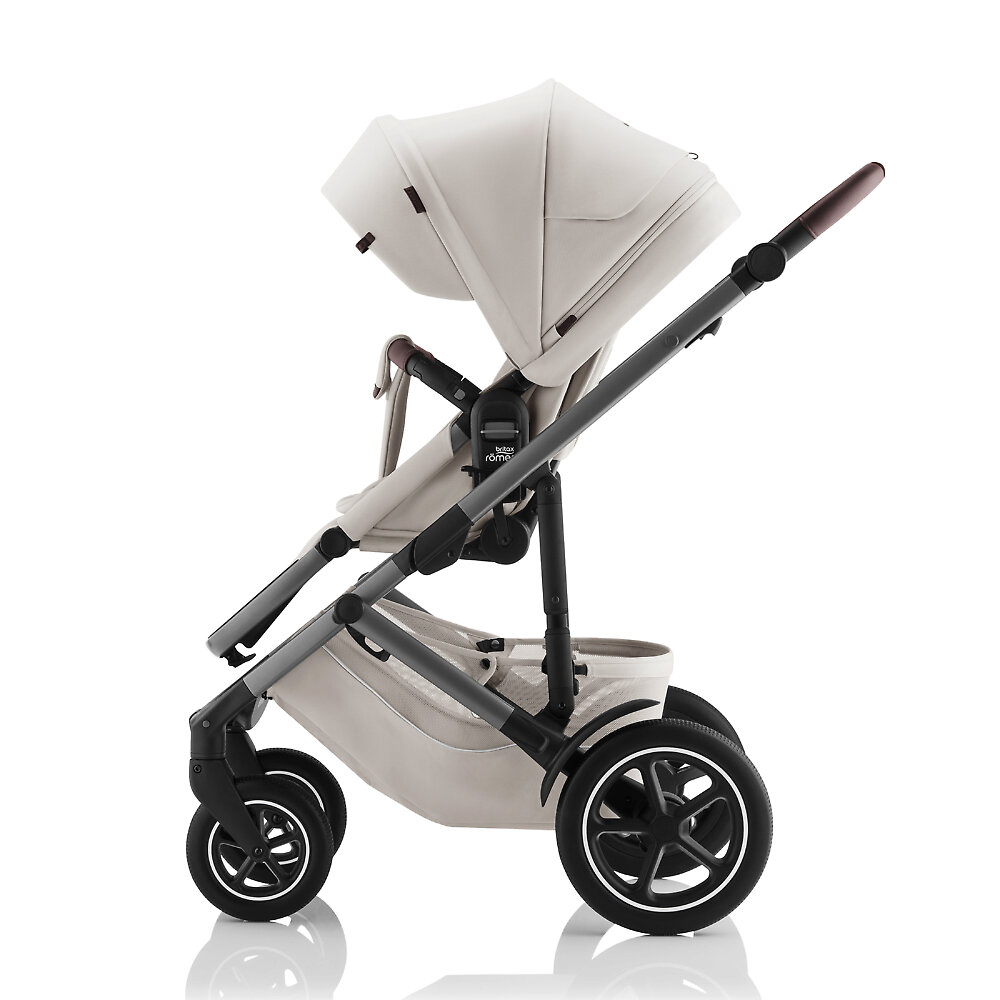Шасси Britax Roomer Smile 5Z LUX – это прочная и устойчивая алюминиевая рама с интуитивно понятным механизмом складывания по типу «книжка». Эргономичная ручка регулируется по высоте вниз-вверх в большом диапазоне, она покрыта тактильно приятной экокожей и имеет по центру резиновый выступ, защищающий ручку когда коляска стоит вертикально в сложенном виде.