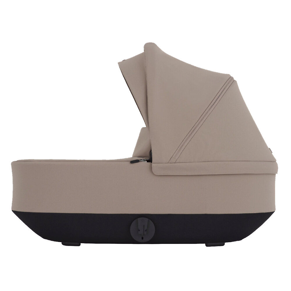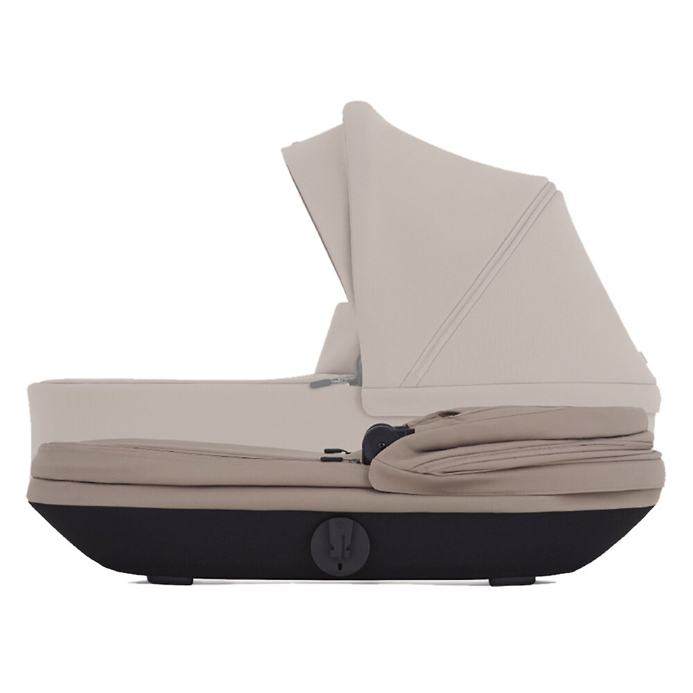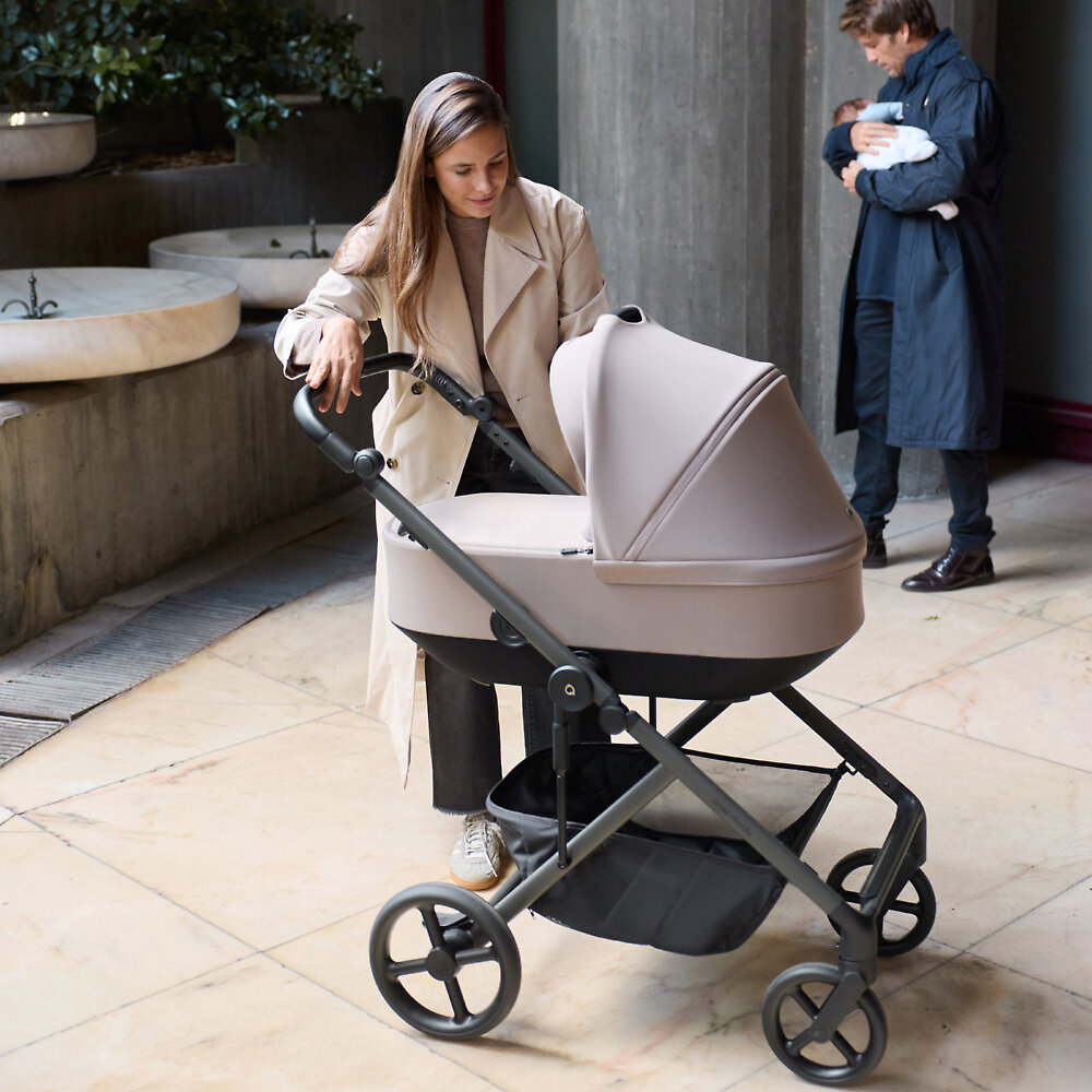 Все внешние материалы коляски обладают водоотталкивающими свойствами и UV-фильтром UPF 50+. Большой капюшон регулируется при помощи двух кнопок по бокам. В дуэте с теплой накидкой на ножки он отлично закрывает малыша от ветра и снега. Накидка крепится при помощи молнии, расстегнуть её можно с обеих сторон. Внутри люльки мягкие гипоаллергенные материалы, которые легко снять для стирки – достаточно расстегнуть молнию. Упругий матрасик изготовлен из материала Sorona – мягкий на ощупь, дышащий и антибактериальный.