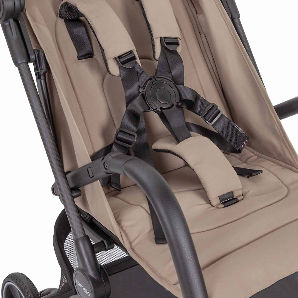 Прогулочная коляска Carrello EvoЗа безопасность маленького непоседы отвечают пятиточечные ремни с мягкими фиксированными накладками на плечи и паховую зону. Верхние ремешки легко регулируются по высоте – просто потяните за накладку и подстройте ремешки под рост ребёнка. Бампер у коляски поворотно-откидной, в чехле из качественной экокожи, он не мешает быстрой посадке и высадке маленького пассажира.