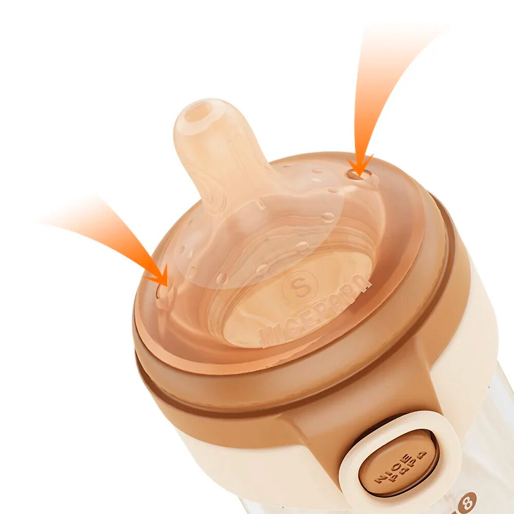 Стеклянная бутылочка NicePapa емкостью 150 мл предназначена для новорожденных. Она имеет широкое горлышко, что облегчает её мытьё, и специальный антиколиковый клапан, который помогает предотвратить колики и уменьшить газообразование у малыша. Корпус бутылочки сделан из стекла, а соска – из силикона.