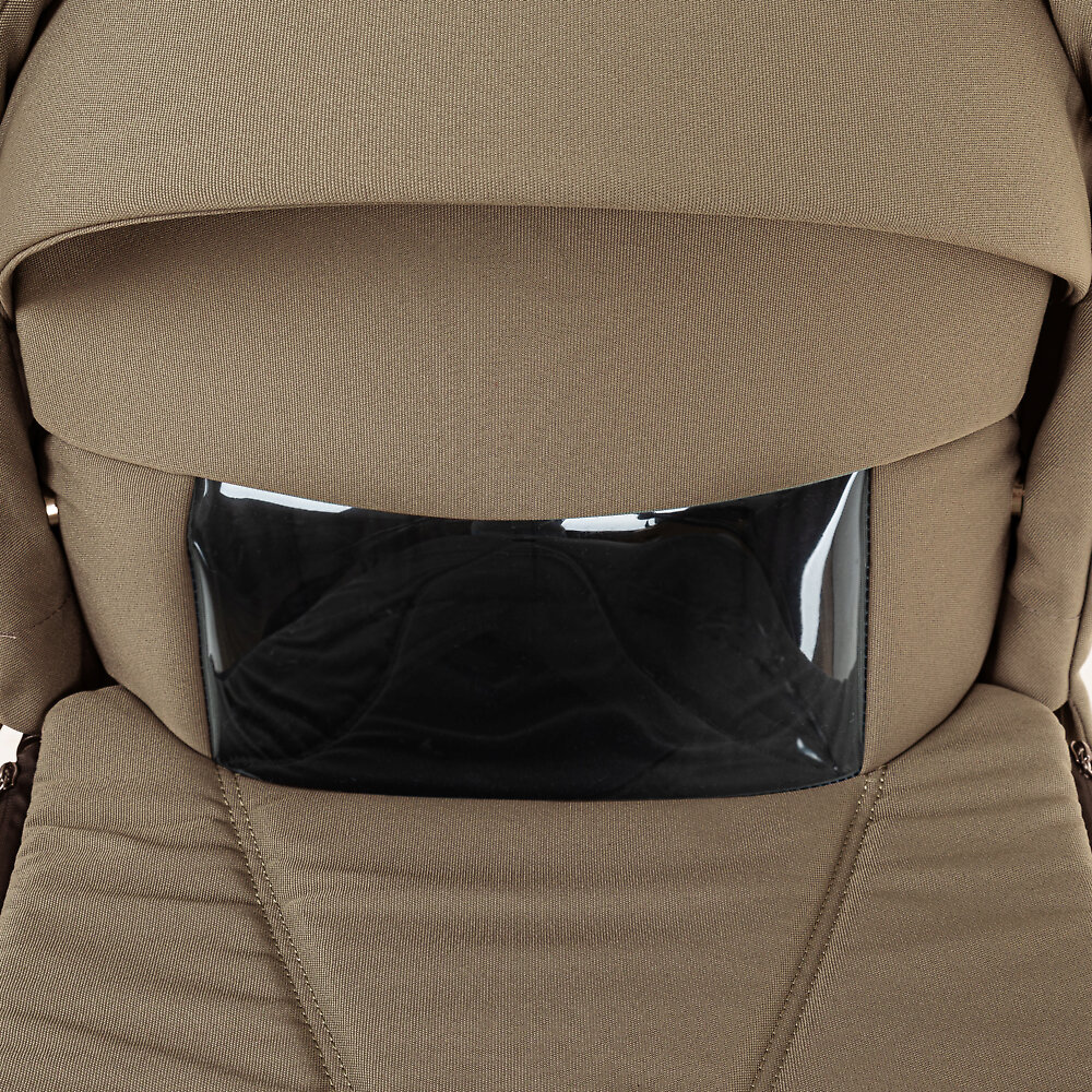 Капор люльки регулируется при помощи двух кнопок по бокам. Антимоскитная сетка входит в комплект и надежно защищает малыша от назойливых насекомых. Чехол на ножки легко крепится молнией и оснащен дополнительным высоким отворотом с большим смотровым силиконовым окошком. Отворот бесшумно фиксируется магнитами, обеспечивает максимальную защиту от непогоды и создаёт уютную атмосферу внутри спального блока для младенца.