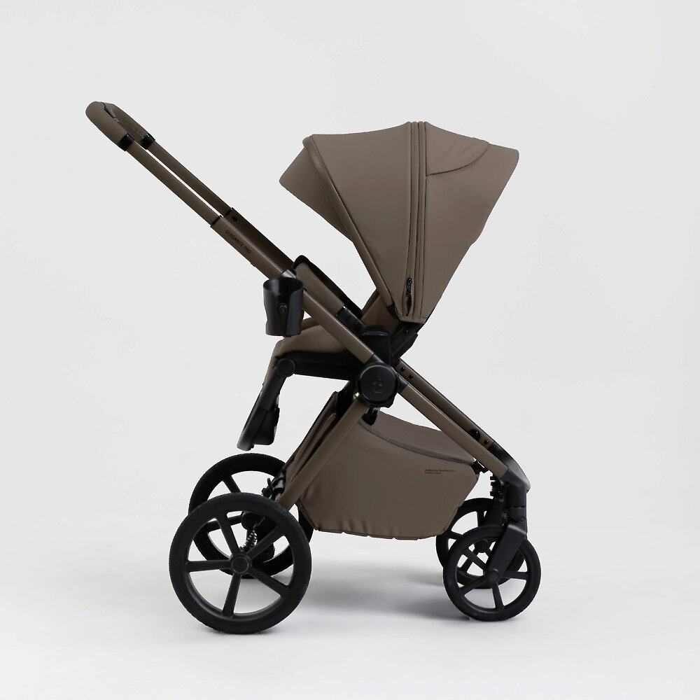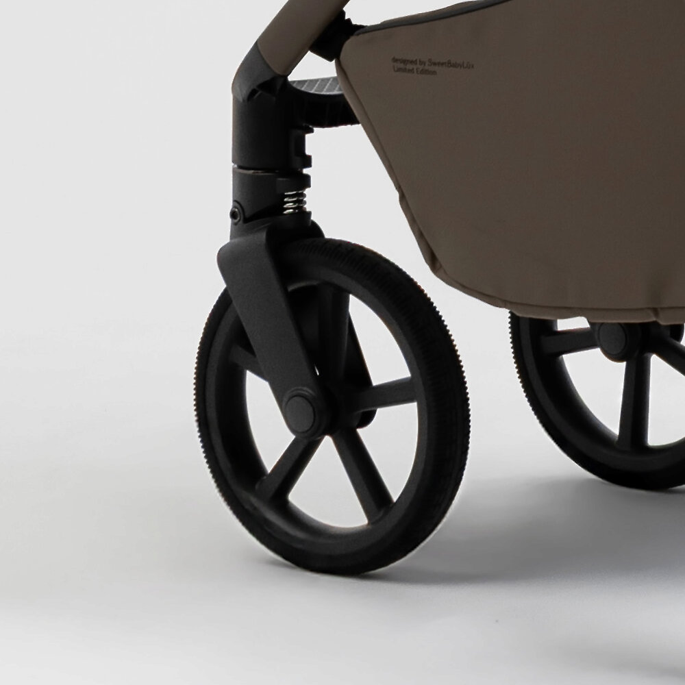 Колёса с глубоким протектором из износостойкого инновационного материала не подвержены проколам и не требуют подкачки. Они обеспечивают уверенное сцепление с любой поверхностью и отличную проходимость. Пружинная амортизация на всех колёсах гарантирует мягкий и плавный ход даже на неровных участках. При движении по песку или снегу передние колёса можно заблокировать в прямом положении для лучшей проходимости. Вместительная корзина с откидным бортиком без труда вместит всё, что может пригодиться вам и малышу во время прогулки.