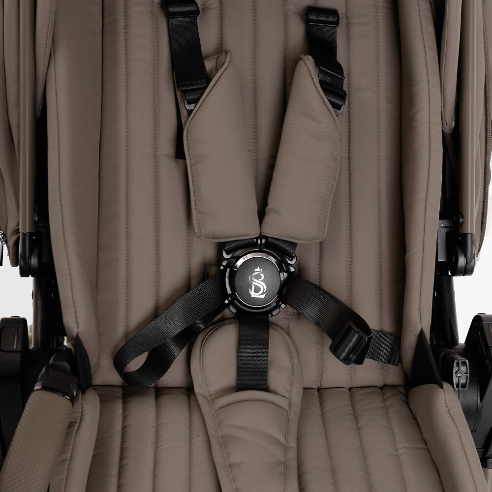 В знойный день в прогулочном блоке работает пассивная система вентиляции: перфорированная спинка и большое вентиляционное окно в капюшоне пропускают воздух внутрь, создавая комфортный микроклимат. Спинка легко регулируется при помощи рычажка в трех положениях: сидячее, полулежачее и полностью горизонтальное. Опустите спинку и поднимите подножку – уютное гнездышко для сна готово! За безопасность непоседы в коляске отвечают пятиточечные ремни с мягкими накладками и магнитным замком, поворотно-откидной бампер и межпаховая перемычка.