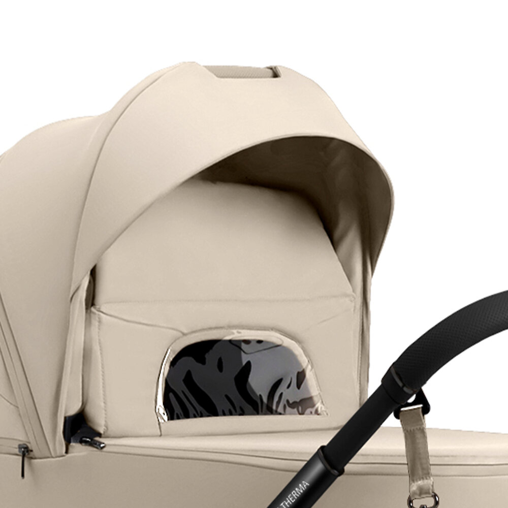 Большой капор спального блока Sweet Baby Elegante Therma Colore надежно защищает от ветра и непогоды. Теплая накидка на ножки крепится к бортам люльки молнией. Дополнительный отворот со смотровым окном позволяет превратить спальный блок в непродуваемый кокон, что особенно актуально зимой. Трехуровневая система вентиляции обеспечивает свободную циркуляцию воздуха в жаркие летние дни. Откройте сетчатые секции в капюшоне, изголовье и изножье, чтобы малышу не было душно. В серии Therma производитель заменил сетчатую секцию на капюшоне окном со шторкой на магнитах.