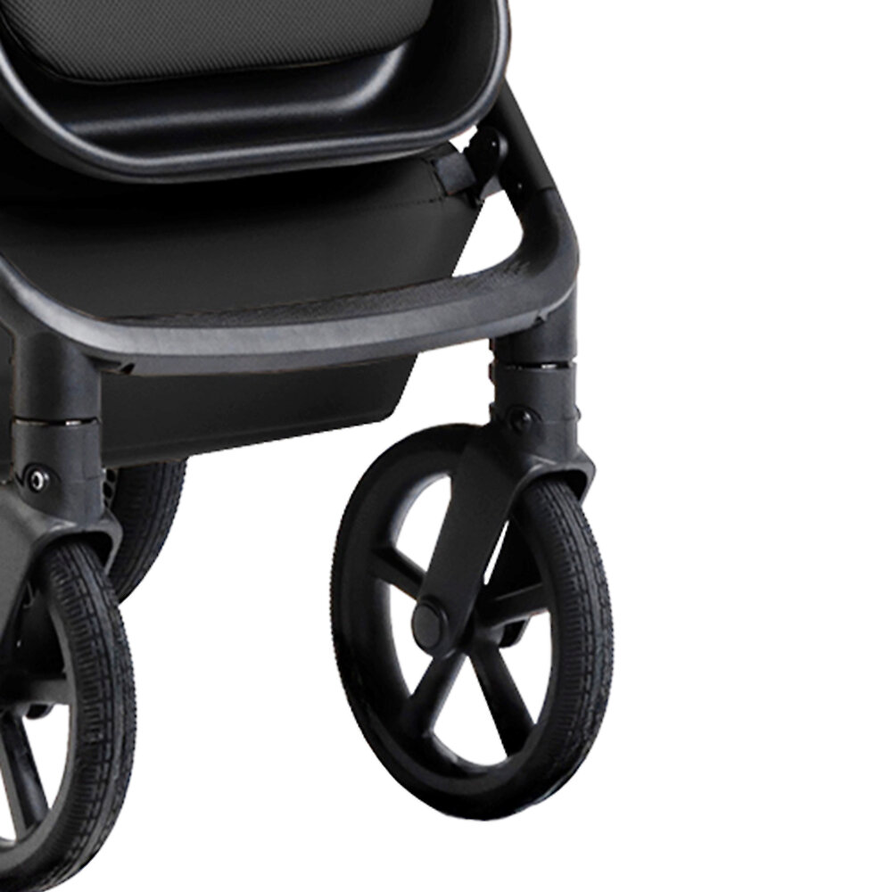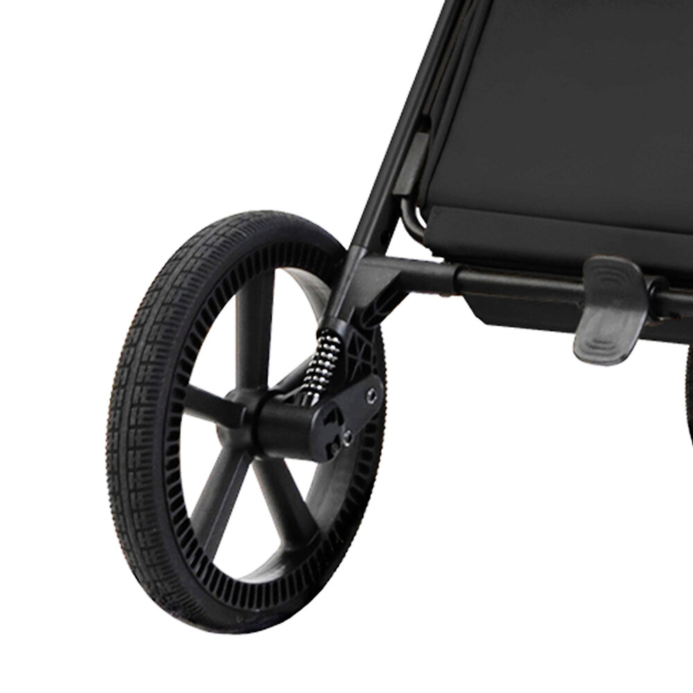 Колеса с глубоким протектором не боятся проколов и не нуждаются в подкачке. Они имеют хорошую проходимость и отличное сцепление с любым дорожным покрытием. Пружинная амортизация на всех колесах гарантирует мягкий и плавный ход даже по проблемной поверхности. При движении по особо сложным участкам, переднюю пару колес можно зафиксировать в прямом положении.